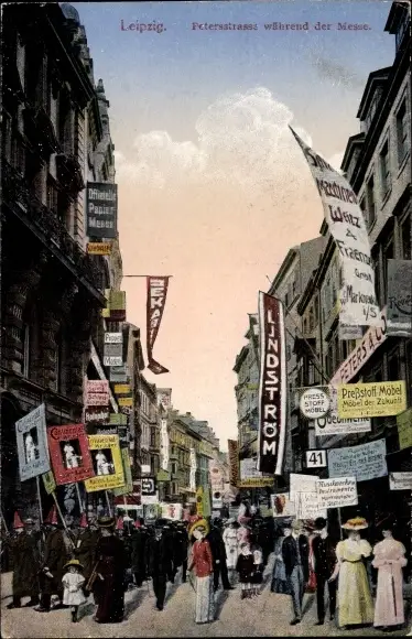 Ak Leipzig in Sachsen, Petersstraße während der Messe, Reklameschilder