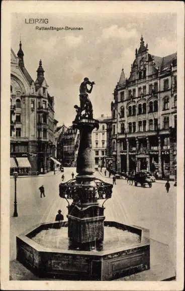 Ak Leipzig in Sachsen, Rattenfänger-Brunnen, Straßenpartie, Geschäfte, Passanten
