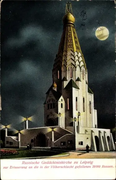 Ak Leipzig in Sachsen, Russische Gedächtniskirche, Nachtansicht mit Mond