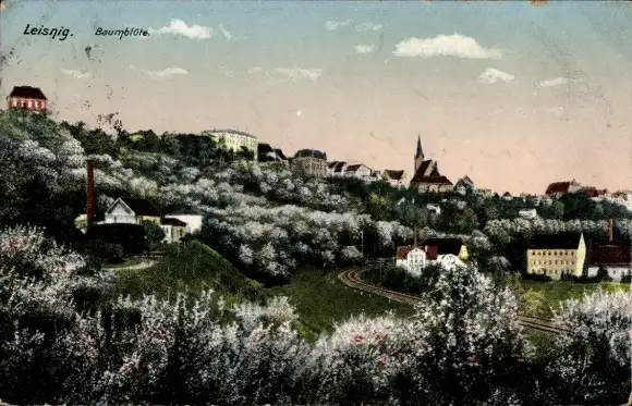 Ak Leisnig in Sachsen, Totalansicht, Baumblüte