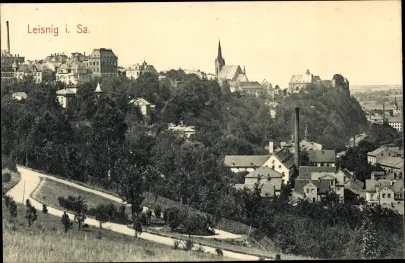 Ak Leisnig in Sachsen, Totalansicht vom Ort, Berg und Kirche