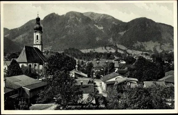 Ak Lenggries a. d. Isar Oberbayern, Teilansicht, Kirche, Gebirge