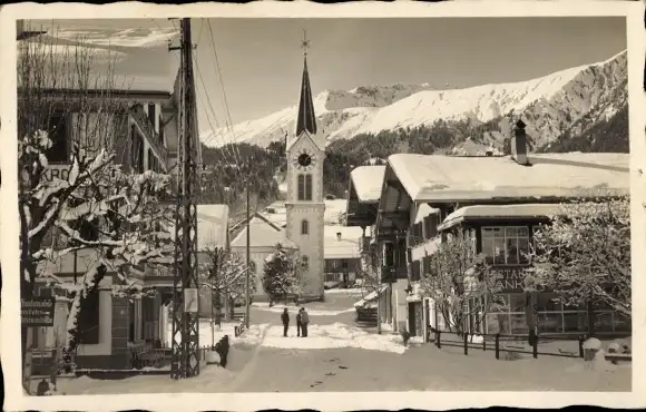 Ak Lenk Kt. Bern, Schneelandschaft, Kirche, Wanderer, Bergpanorama