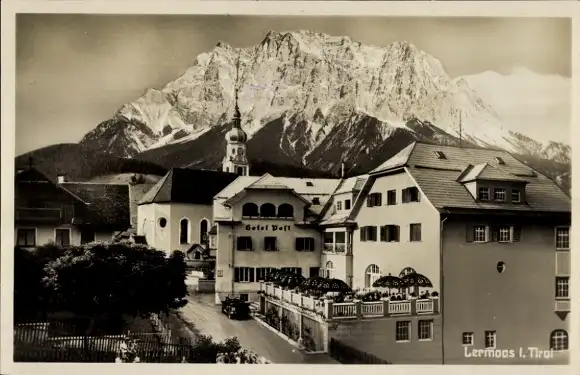 Ak Lermoos in Tirol, Hotel Post mit Zugspitze