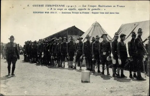 Ak Les Troupes Americaines en France, American Troops in France, supper time, mess tins, 1914-1917