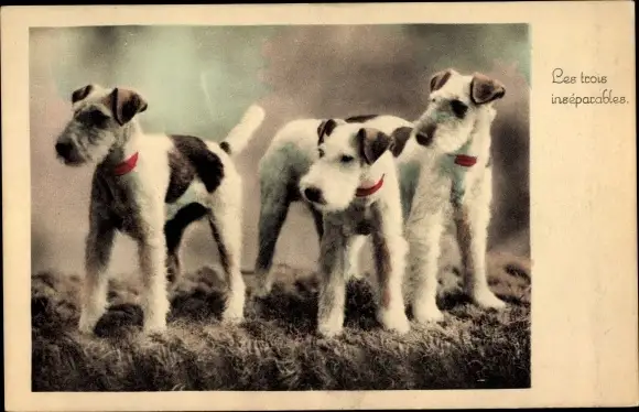 Ak Les trois inseparables, drei junge Terrier, Hunde