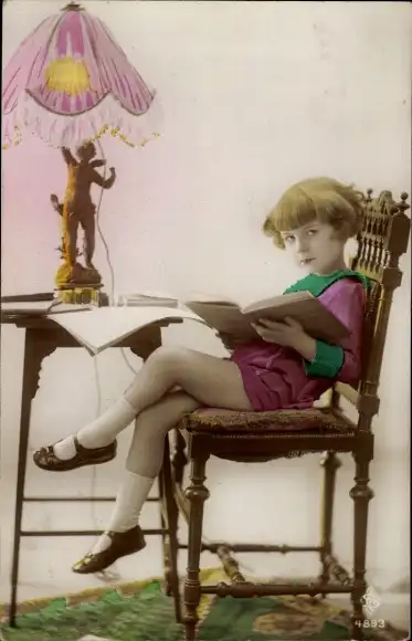 Ak Lesendes Kind auf einem Stuhl, Portrait