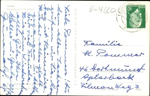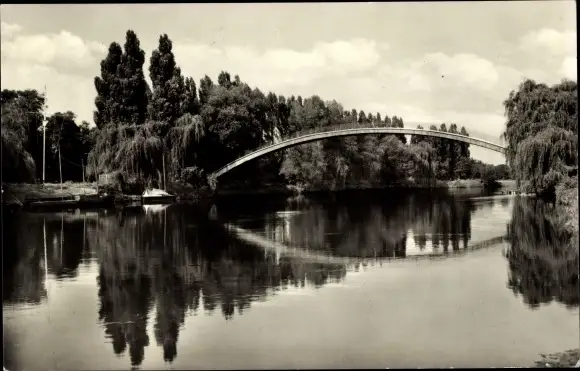 Ak Leuna an der Saale, Eingang zum Waldbad, Brücke