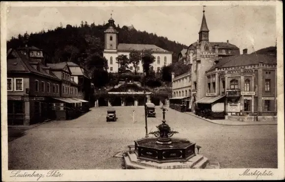 Ak Leutenberg Thüringen, Marktplatz, Ratskeller, Stadtsparkasse, Brunnen, Kirche, Autos