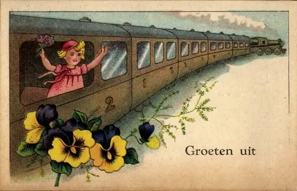 Ak Liebe Grüße, Lok in Fahrt, Stiefmütterchen, winkendes Mädchen