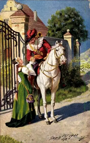 Ak Liebespaar, Abschied, Weißes Pferd, Trompeter