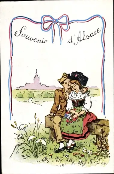 Ak Liebespaar, Frau in Elsässer Volkstracht, Soldat