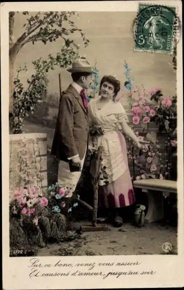 Ak Liebespaar, Jäger, Jagdwaffe, Blumen, Liebe, Garten