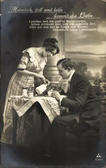 Ak Liebespaar, Kaffeekanne, Rauchender Mann