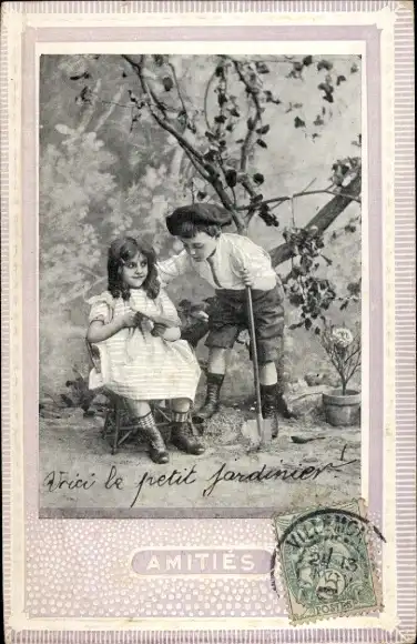 Ak Liebespaar, Kinder, Baum, Blume im Blumentopf