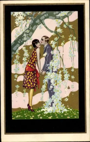Ak Liebespaar, Kuss, Blühender Baum