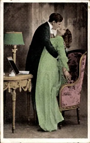 Ak Liebespaar, Kuss, Tisch, Tischlampe