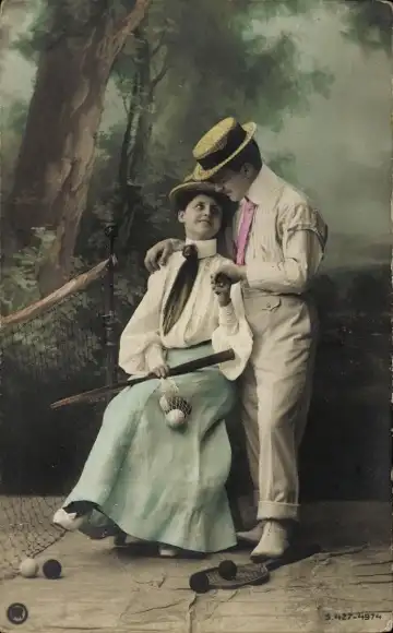 Ak Liebespaar, Tennisplatz, Tennisschläger