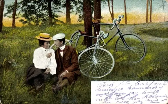 Ak Liebespaar, Wiese, Gespräch, Fahrräder