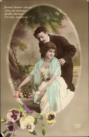 Ak Liebespaar auf einer Bank, Stiefmütterchen
