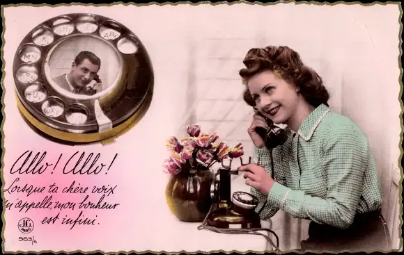 Ak Liebespaar beim Telefonieren, Telefon, Blumen, Blumenvase, Kitsch