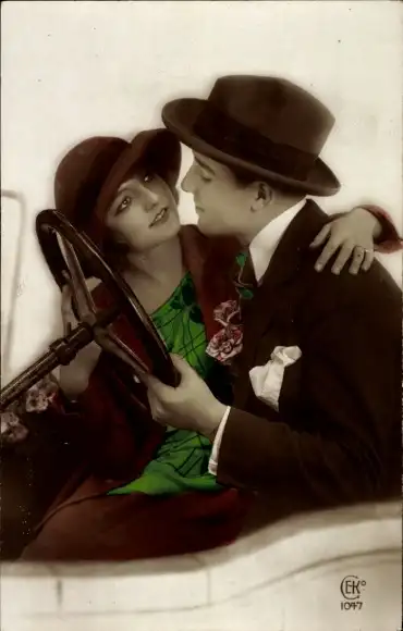 Ak Liebespaar im Auto, Lenkrad, Hut