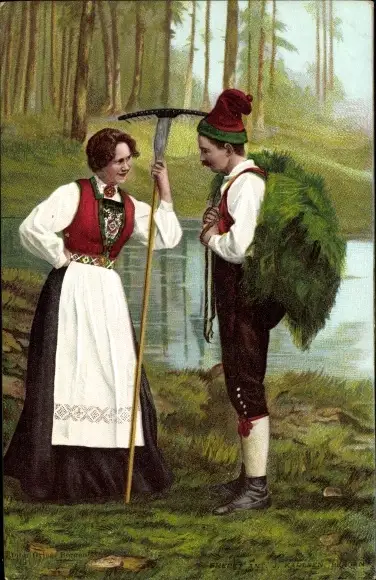 Ak Liebespaar in norwegischen Trachten, Frau mit Harke
