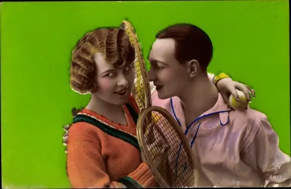 Ak Liebespaar mit Tennisschlägern, Umarmung