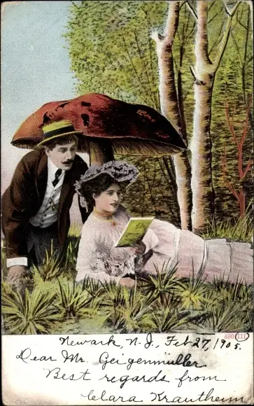 Ak Liebespaar unter dem Schirm eines Pilzes