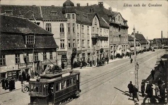 Ak Liepaja Libau Lettland, Stadt nach der Einnahme, Straßenpartie, Straßenbahn
