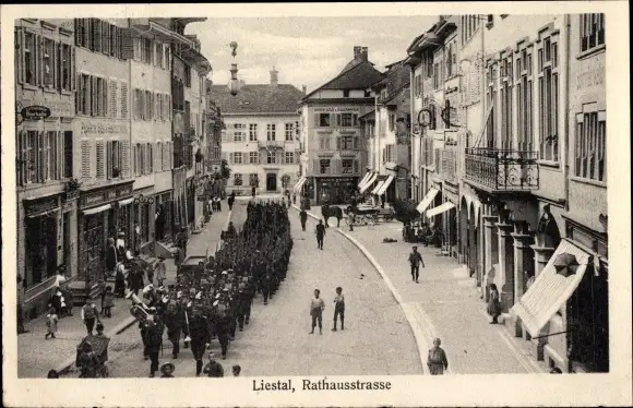 Ak Liestal Kanton Basel Land Schweiz, Rathausstraße, Militärparade