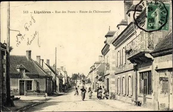 Ak Lignières Cher, Rue des Ponts, Route de Chateauneuf
