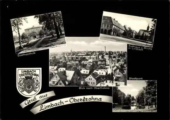 Ak Limbach Oberfrohna in Sachsen, Wappen, Goetheschule, Stadtpark, Rathaus und Kirche
