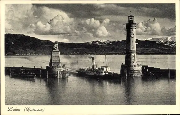 Ak Lindau Bodensee, Hafeneinfahrt, Dampfer, Leuchtturm