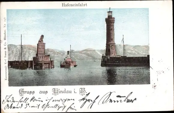 Ak Lindau am Bodensee Schwaben, Hafeneinfahrt, Leuchtturm, Salondampfer