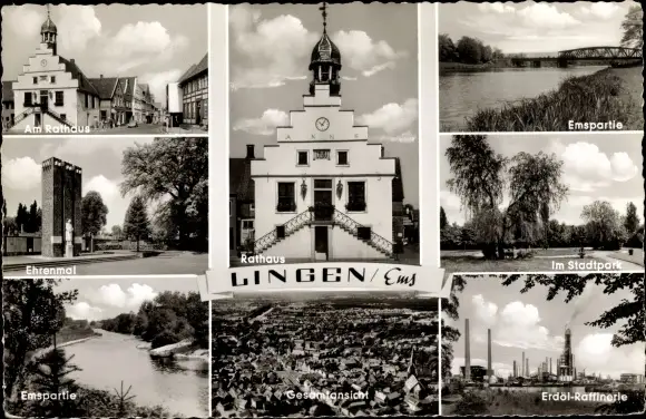 Ak Lingen Ems, Rathaus, Erdöl Raffinerie, Stadtpark