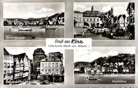 Ak Linz am Rhein, Marktplatz, Rheinfähre, Burgplatz mit Rheintor