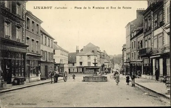 Ak Livarot Calvados, La Rue de Falaise, Place de la Fontaine