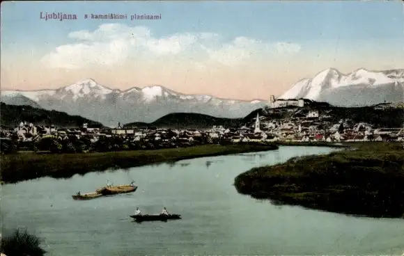 Ak Ljubljana Laibach Slowenien, Gesamtansicht, Berge, Fluss