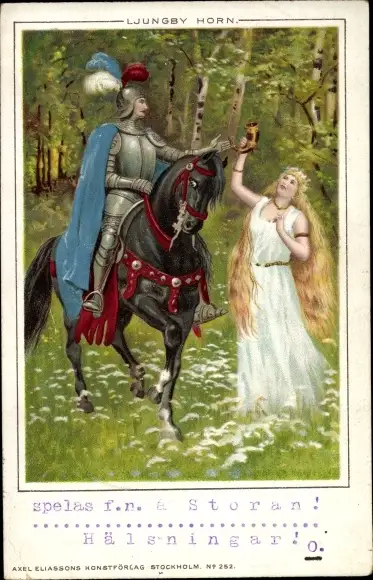 Ak Ljungby Horn, Frau in weißem Kleid, Ritter zu Pferde, Horn