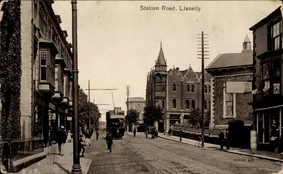 Ak Llanelly Wales, Station Road, Straßenbahn