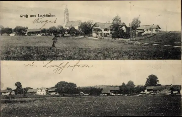 Ak Lochhofen Sauerlach in Oberbayern, Teilansicht des Ortes, Kirche, Bauernhäuser