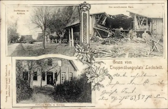 Ak Lockstedt in Holstein, Lockstedter Lager, zerschossenes Haus, Wache, Dorfstraße in Ridders