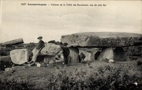 Ak Locmariaquer Morbihan, Dolmen de la Table des Marchands, vue du côté Est, zwei Personen