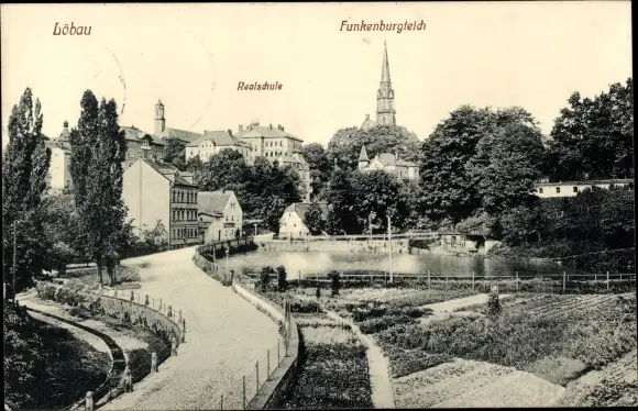 Ak Löbau in Sachsen, Realschule, Funkenburgteich