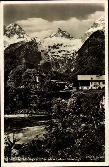 Ak Lofer in Salzburg, Teilansicht des Ortes mit Saalach und Loferer Steinberge