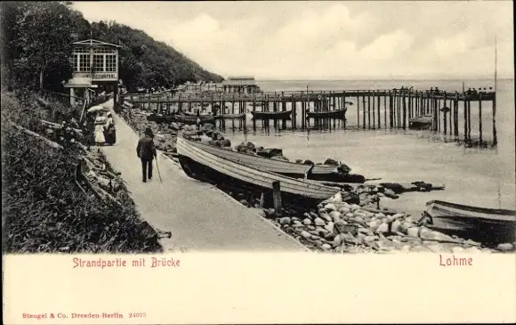 Ak Lohme auf Rügen, Strandpartie, Brücke, Promenade, Boote