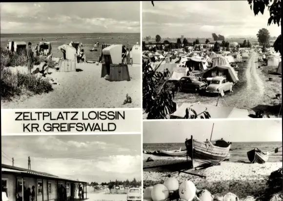 Ak Loissin in Vorpommern, Zeltplatz, Strandpartie, Strandkorb, Boote