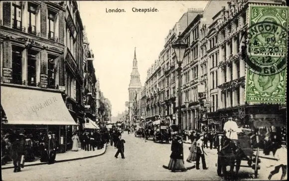 Ak London Großbritannien, Cheapside, Kirchturm, Geschäfte