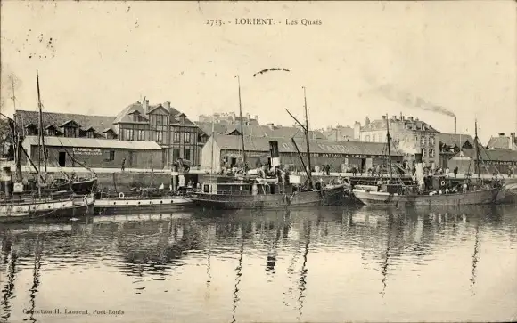 Ak Lorient Morbihan, Hafenansicht von Boote, Gebäude am Quai,